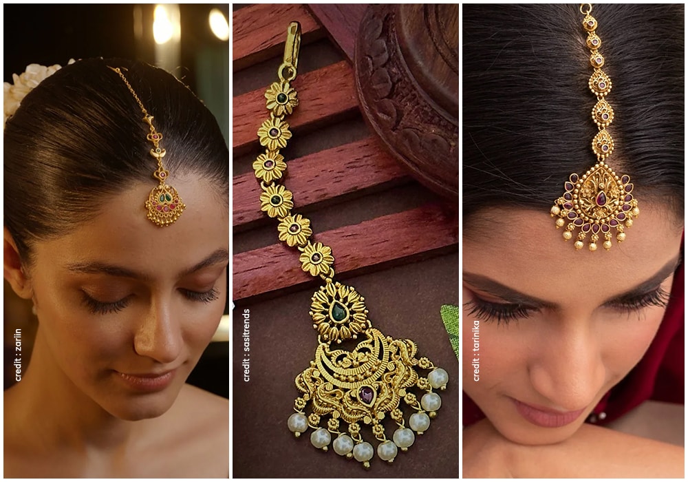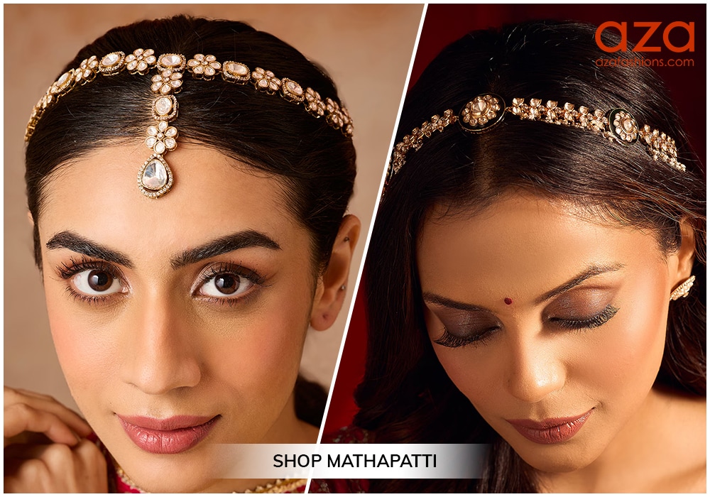 This is the most common style, featuring a single chain that hooks into the hair and ends with a pendant that sits on the forehead. It is versatile, elegant, and suits almost every face shape. Whether it’s a simple stone pendant or a complex Kundan design, the classic tikka is a wardrobe staple.The Majestic Mathapatti