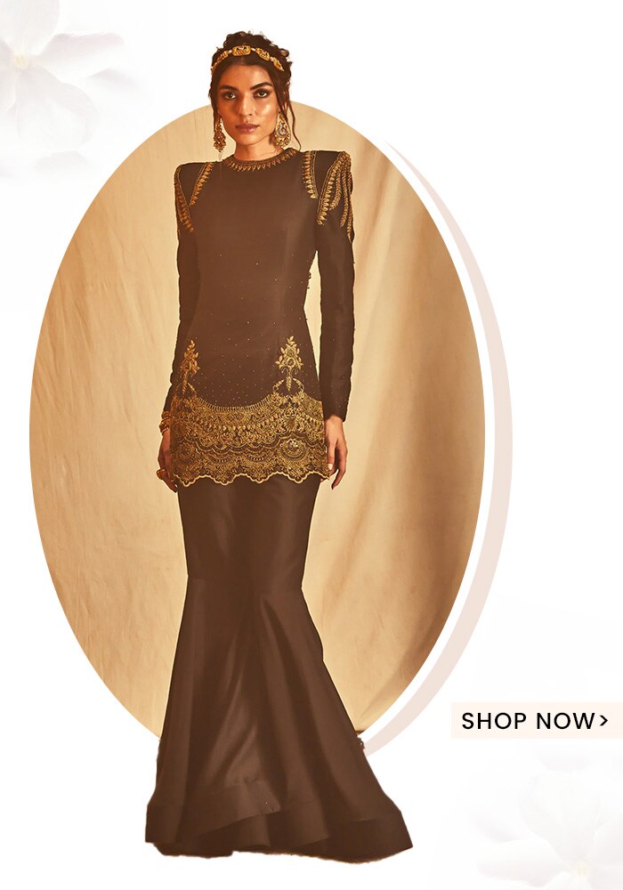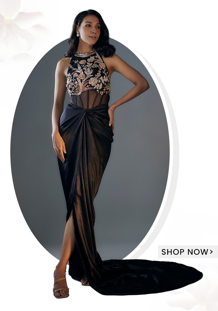 Designer black wedding dresses will never fail you. A classic choice, black dresses ßare great statement pieces to wear at any wedding party. You can go for satin black gowns for a sophisticated look and accessorize them with dainty jewelry pieces. Complete your look with kitten heels or stilettos along with an embellished silver clutch. You can even add a Sabyasachi belt to elevate your basic black dress.