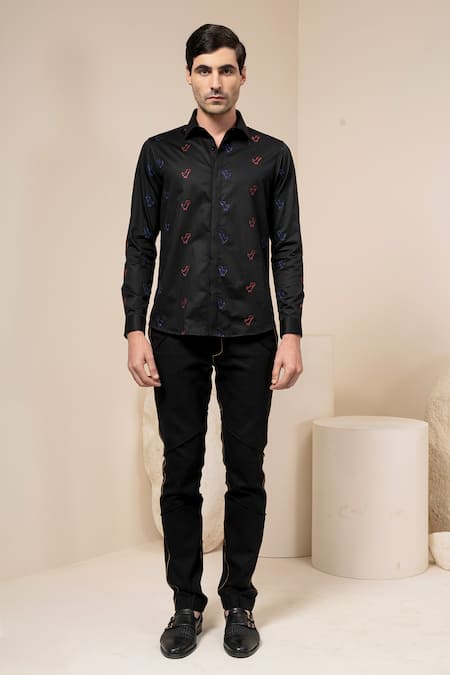 Buy_Abkasa_Black Cotton Dinosaur Embroidered Shirt_Online_at_Aza_Fashions