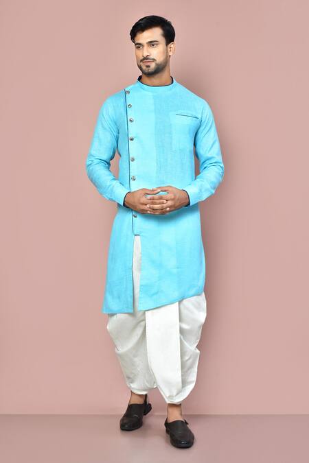 Sky blue kurta featuring full sleeves and asymmetric button detail. Paired with a dhoti pant.