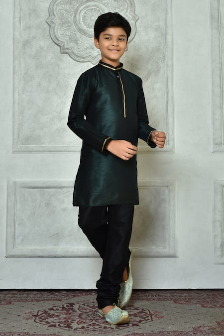 Bottle green dupion art silk kurta featuring an embroidered placket and collar. Paired with a beige churidar for a complete look.