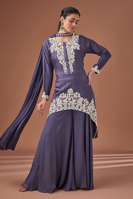 Blue high-low kurta featuring floral pearls and thread embroidery. Paired with coordinating palazzo and dupatta.