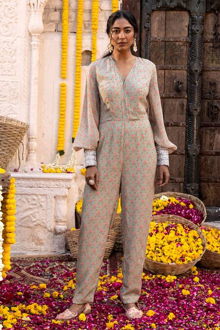 Sage green jumpsuit with all-over floral printed motifs, hand embroidered sleeve cuffs in sequin & bead work.