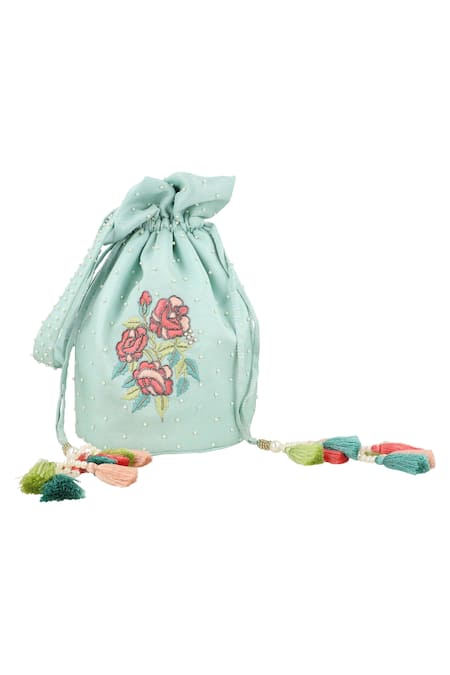 Aqua potli bag featuring multi-color floral motif thread work and all-over bead embellishments