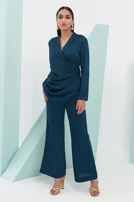 Sea green satin crepe wrap jacket with shawl collar & side gathered draped details. Paired with boot cut trousers with side pockets.