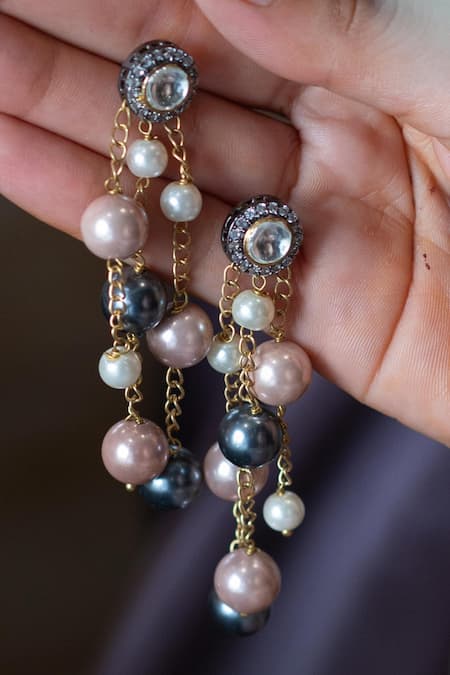 22k gold and rhodium plating, Intricate pearl drop detailing, Polki and cubic zirconia embellishments