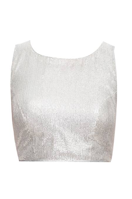 Buy_Vandana Sethi_Silver Sequined Scoop Neck Embellished Blouse_at_Aza_Fashions