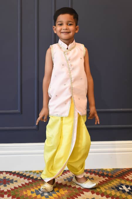 Pink silk kurta featuring a mandarin collar and thread work embroidery. Paired with a yellow dhoti pant with embellished detailing.