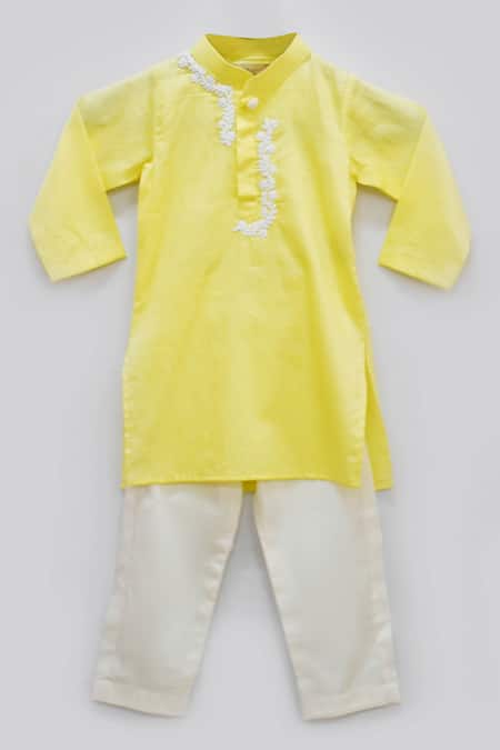 Yellow kurta featuring white floral embroidered motifs with side slits. Paired with matching pants for a complete look.