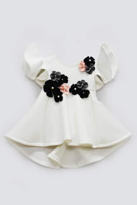 Floral applique embroidered motifs on the front., Ruffle sleeves for added style.