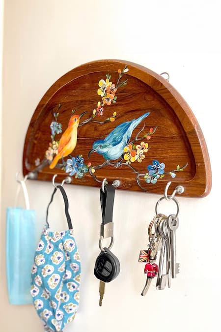 Brown handmade acacia wooden key & mask holder in a semi-circular half-moon shape with hand painted bird- floral motifs, matt finish & 4-steel hooks.