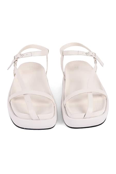 White wedges featuring an asymmetric strap design and a comfortable footbed