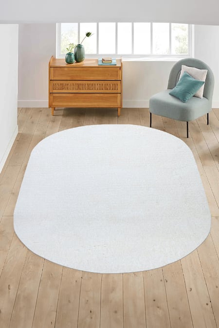 White tailor made hand tufted polyester rug in oval shape & shaggy finish detail.
