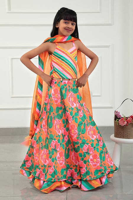 Multi-color lehenga featuring floral print with ruffle detailing. Paired with a stripe pattern blouse and a sheer dupatta.