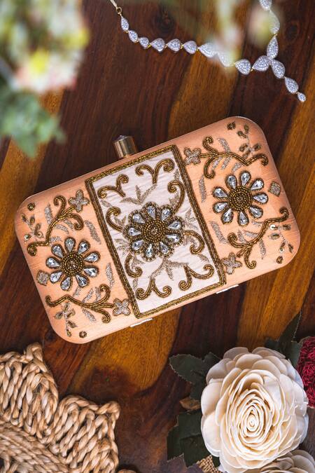 Buy_NR By Nidhi Rathi_Peach Hand Embroidered Maha Raw Silk Clutch With Sling_Online_at_Aza_Fashions