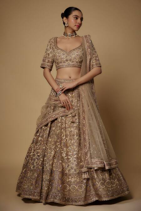 Beige lehenga featuring intricate phool bahar thread embroidery with cutdana, sequins, and beads. Paired with an elbow sleeves padded blouse with a deep paan neckline and a net embroidered border dupatta.