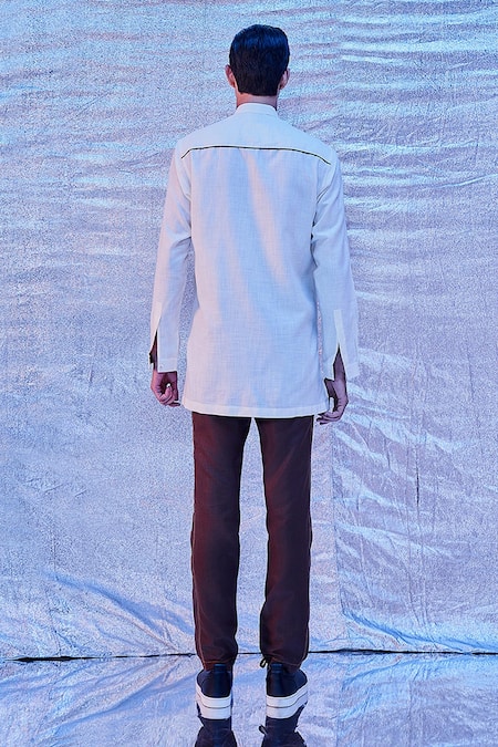 Off white kurta featuring patchwork detailing and a mandarin collar