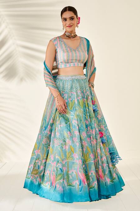 Powder blue lehenga with multi colored wild plants & flamingo prints. Comes with subtle embroidered choli & dupatta.