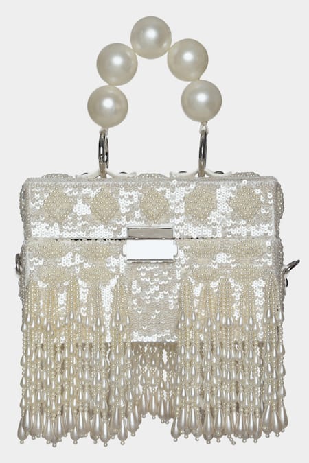 Ivory mini box handle bag featuring geometric motifs and sequin-bead embellishments