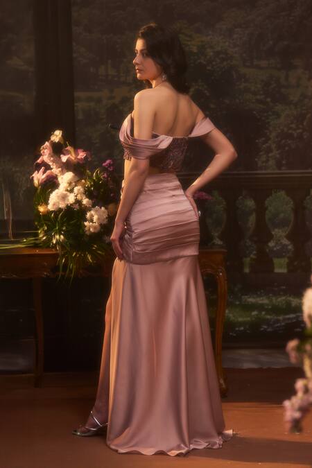 Blush pink off shoulder padded blouse featuring cut dana and applique details. Comes with a satin draped skirt.