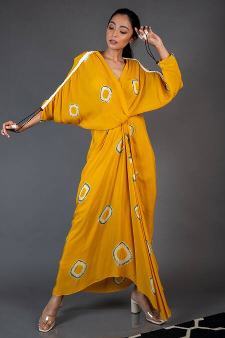 Yellow Crepe Geometric V Neck Printed Draped Dress