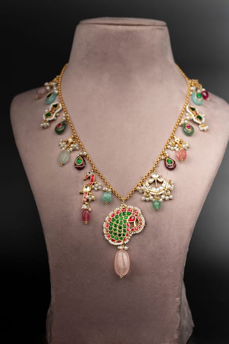 Gold pendant necklace featuring multiple charms embellished with polki, stones, pearls, and bead drops