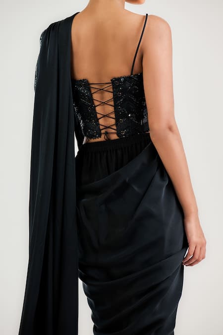 Black pre-draped saree made from silk charmeuse featuring beaded embellishments