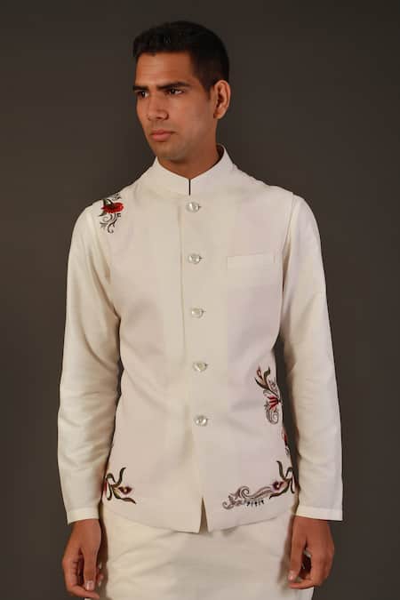 Ivory silk lined matka silk bundi with front buttons, patch pocket & placement floral embroidery.