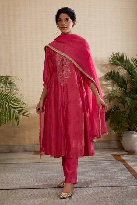 Pink Silk Organza, Silk, Chanderi Embroidery, Sadabahar Placket Kurta Set
