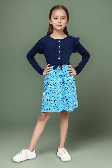 Navy full sleeves dress featuring a blue printed skirt with heart motifs