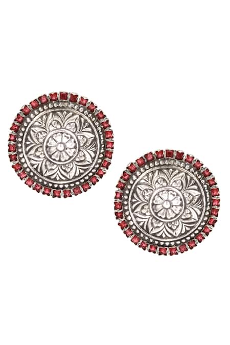 Silver stud earrings featuring a floral carved design with red stone embellishments