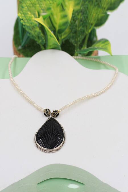 Silver toned pearl string pendant necklace featuring an onyx leaf embellishment
