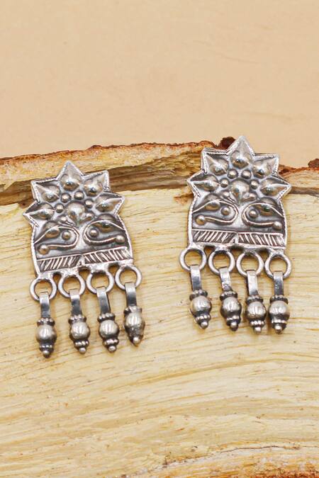 Silver toned geometric pattern oxidised earrings featuring tribal pattern floral carvings