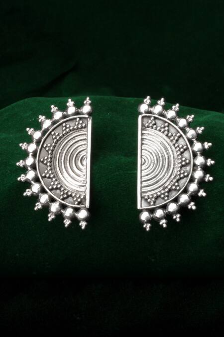 Silver tone vintage inspired semicircle motif studs featuring tribal motifs