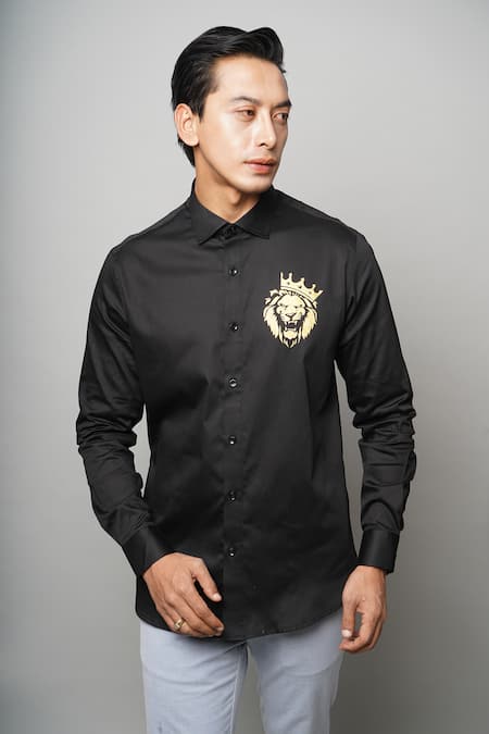 Black cotton shirt with hand-painted gold lion motif on the side.