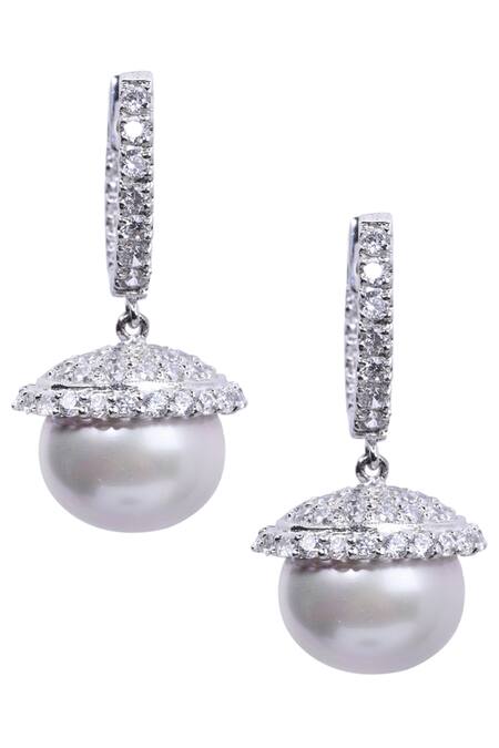 Silver danglers with encrusted cubic zirconia stone hoop & grey pearl drop.