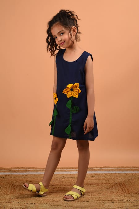 Blue Cotton Applique Sunflower Dress