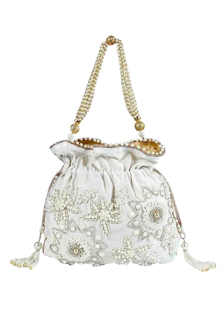 Floral motifs embroidered on one side, Beaded wristlet for easy carrying, Tassel pull-out drawcord closure