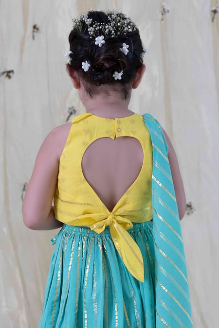 Blue A-line flare lehenga with woven stripe pattern. Paired with a sleeveless yellow blouse featuring hearts pattern and a coordinating dupatta.