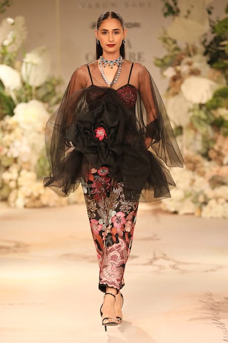 Buy_Varun Bahl_Black Chanderi Silk, Net Embroidery, Sequins Floral Bloom Jumpsuit With Cape _at_Aza_Fashions