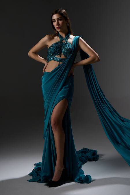 Royal Blue Beaded Strap Gown With Dupatta