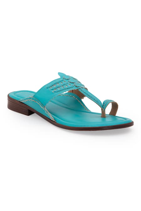 Turquoise Kolhapuris featuring braided strap, toe-ring, and floral motifs