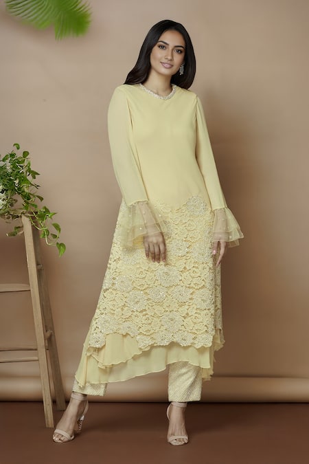 Buy_Aariyana Couture_Yellow Georgette, Bamboo, Silk Embroidery Round Neck Kurta With Pants_Online_at_Aza_Fashions