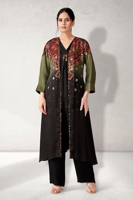 Green and black cape featuring an ombre effect with floral embroidery. Paired with a tassel detailed top in satin organza fabric.