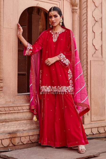 Buy_Ajiesh Oberoi_Pink Velvet, Organza Embroidery, Beads Keyhole Neck Kurta Gharara Set _Online_at_Aza_Fashions