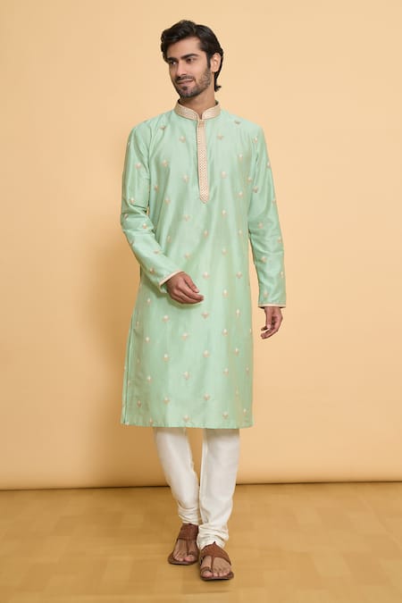 Green straight kurta featuring geometric leaf embroidery with lace embellished collar and front placket. Paired with a solid white churidar with an elasticated waistband.