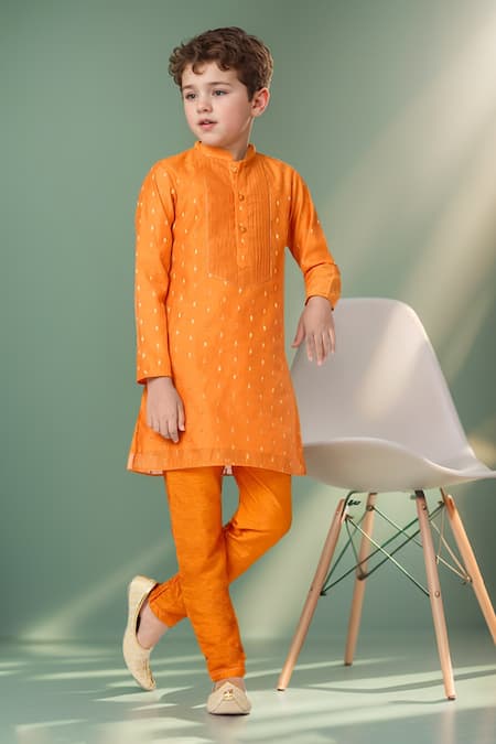 Orange kurta featuring pintuck detailing and zari butta accents. Paired with a solid churidar with an elasticated waistband.