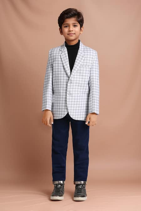 Grey blazer featuring a checked pattern with full sleeves and a classic lapel collar