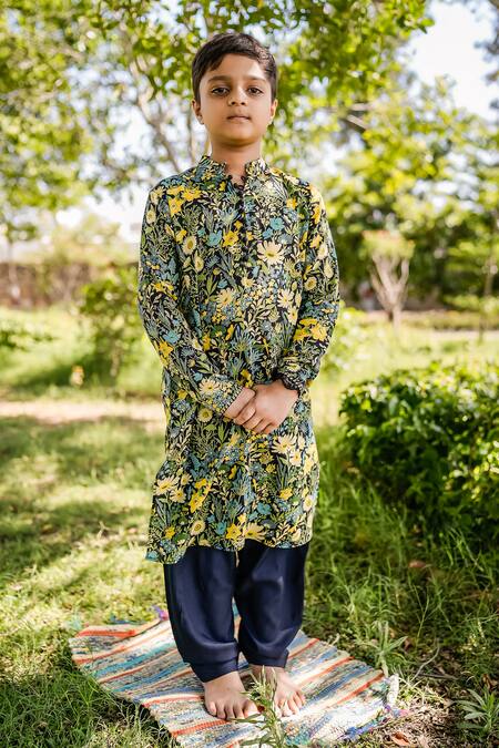 Multi color kurta featuring floral prints, potli button placket & side slits. Paired with matching salwar made from cotton modal.