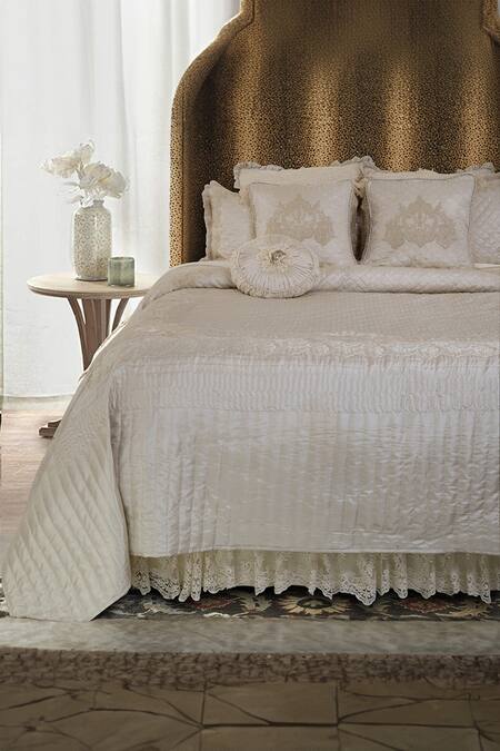 Shop_Diva Riche_Cream Washable Silk Floral Enlace Embroidered Bedding Set_Online_at_Aza_Fashions
